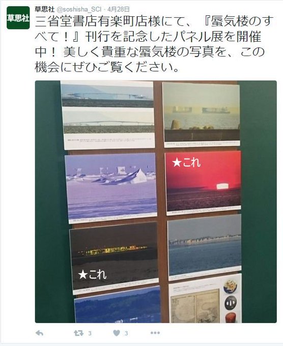 草思社さんツイートにあるとおり、今東京の大型書店数箇所で「蜃気楼のすべて!」ミニパネル展が開かれており、チーム斜里からは2枚展示。本には6枚。斜里の蜃気楼、実は全国に誇れる宝モノです♪ twitter.com/soshisha_SCI/s… pic.twitter.com/fRfztyfVeK