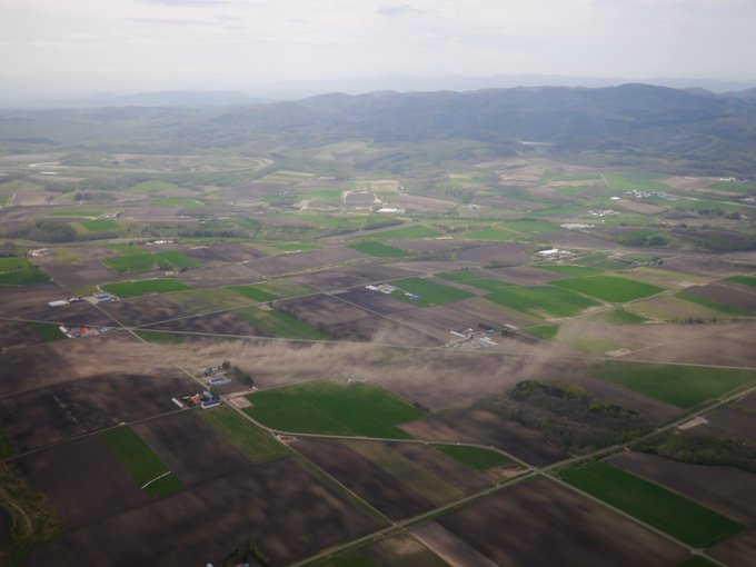 通称「馬糞風」とも呼ばれる春の強風が吹き荒れ埃っぽい網走地方、女満別空港に降り立つ直前に飛行機から撮影しました。順に網走湖の西側、濤沸湖の南側、舞い上がった砂が海へ流れる様子、そして斜里方向です。 pic.twitter.com/ffGqME0WGu