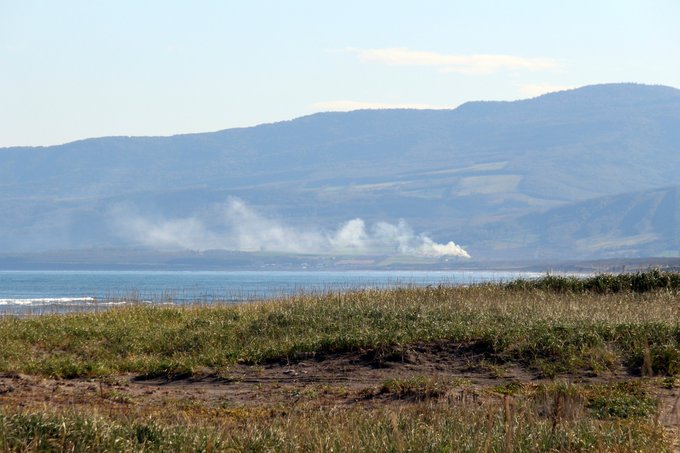 最近、朝だけ天気が良いような?たなびく峰浜の煙、下位で宇宙船みたいな船、うーん、もしかして上にも伸びている?判断つかない日の出方向。 pic.twitter.com/xNfGlSzoWT