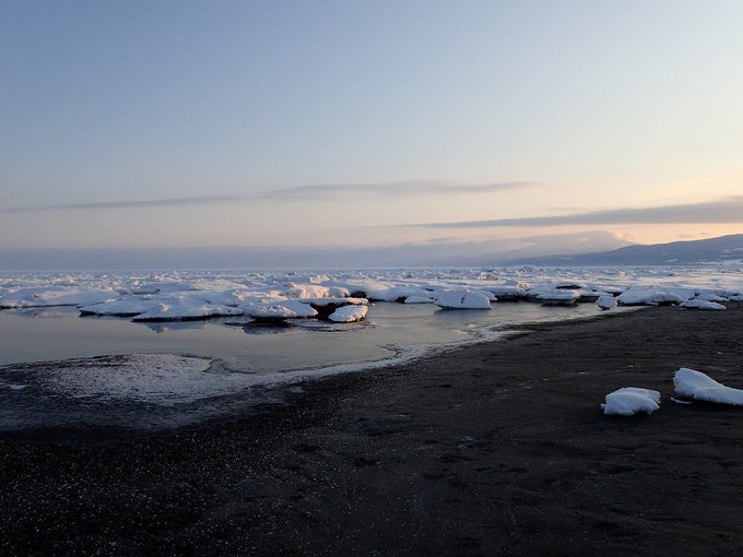 2/13 四角い太陽挑戦は空振り。野付半島から標津町方向、ただ撮っただけで水彩画のように。塔はたぶん、てっぺんにイクラが乗ってる例の建物。 pic.twitter.com/bhq7hNxpi4