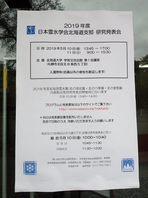 昨日まで札幌で行われた、日本雪氷学会北海道支部の研究発表会、北見工大の先生の発表聴講に行ってきました。蜃気楼の研究で恐れ多くも共著者とさせていただいてます。会場隣の植え込みにはオオバナノエンレイソウ。頼もしい学生さんとも出会えて充実の一日でした。 pic.twitter.com/ceH3HukpXa